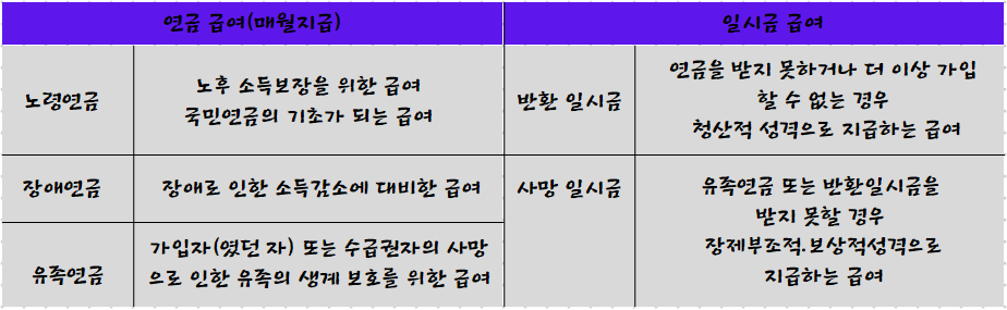국민연금은 나이가 들거나 장애 또는 사망으로 이해 소득이 감소할 경우 일정한 급여를 지급하고 소득을 보장하는 제도입니다. 사회보험으로서 지급받게 되는 급여의 종류는 노령연금(분할연금),장애연금,유족연금,반환일시금,사망일시금 이 있습니다.