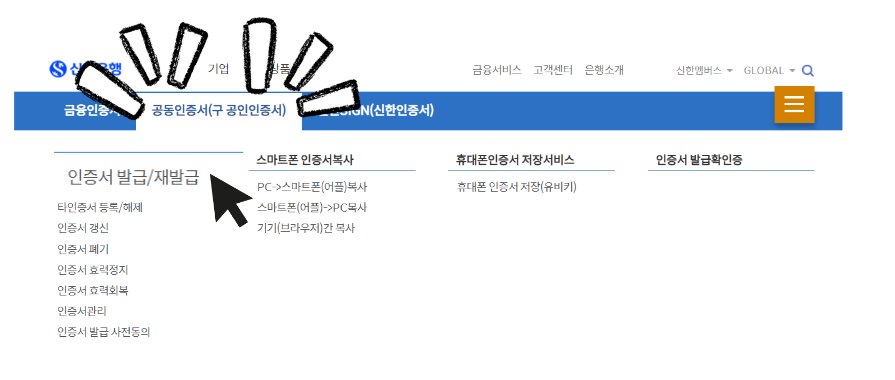 신한은행, 우리은행, 하나은행, 기업은행,국민은행 등등 그리고 모바일 네이버 인증서, 카카오 인증서 등 존재하지만 제가 주로 이용하는 은행 한 곳에서 인증서 발급방법이 어떻게 되는지 알아보려고 합니다.