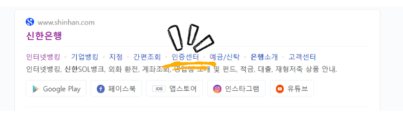 신한은행에서 한번 살펴보려 합니다. 신한은행을 검색 후 보시면 인증센터라고 바로 보입니다. 인증센터를 클릭 후 들어가주세요