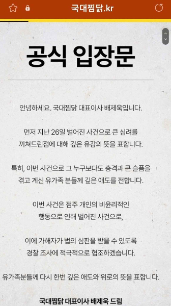 국대찜닭에서는 공식 입장문을 들여다보면 _ 이번 사건은 점주 개인의 비윤리적인 행동으로 벌어어진 사건이다