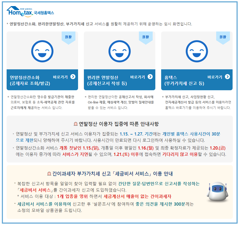 아무래도 제일먼저 진행 해야 할 것은 국세청에 혹은 연말정산 간소화 서비스 검색 후 접속하는 일입니다. 서두에서 말씀드렸듯이 연말정산 이용자 집중에 따라 홈택스 사용기간이 제한되고 있다는 부분을 확인 하실 수 있습니다. 개통 첫날1.15 일 부터 직장인들의 업무시작인 월요일(1.16일) 이때가 아무래도 가장 많이 접속이 지연되지 않았을까 싶습니다.