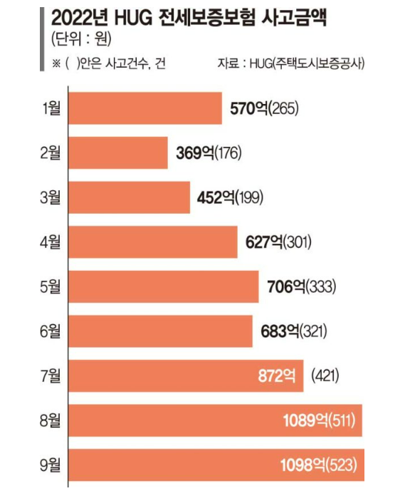 문제는 여기서 끝나지 않았습니다. 집값이 하락하기 시작하면서 깡통전세가 폭증하자 임대인으로부터 보증금을 돌려받지 못하는 전세금 방환 사고가 큰 폭으로 일어나고 있다는 점 입니다. 지난 1월부터 10월까지 집계된 누적 사고 금액만 8,000억 원에 육박했으며, 지난 10월에는 사고 금액이 역대 최대치를 기록하였습니다. 일각에서는 올해 안에 1조 원을 넘어설거 같다는 우려까지 나오고 있는 상태. 심지어 상대적으로 보증금의 규모가 작은 월세 세입자들의 보증금 반황 사고의 도마 위에 올라가 있는 상황입니다. 이마저도 내년, 내후년에는 깡통전세 사기 피해 규모가 더 확대될 전망이라고 전해지고 있습니다.