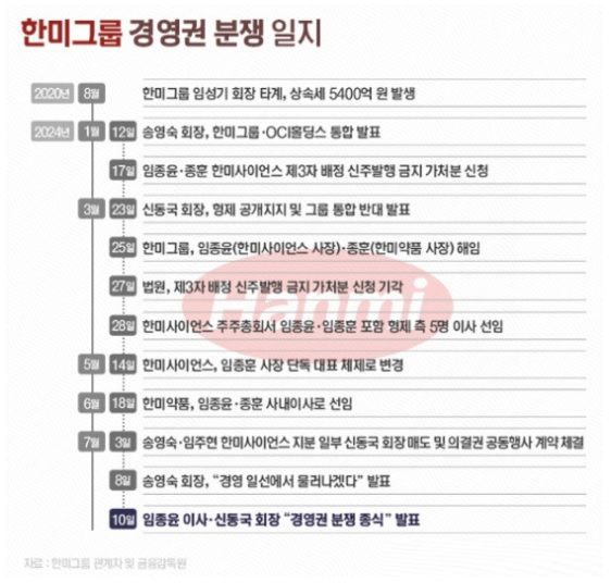 현재 신동국 한양정밀 회장, 송영숙 한미약품 회장, 임주현 부회장 등 '3자 연합'은 한미사이언스에 대한 전문경영인 체제 전환을 주장하며 임종윤 한미사이언스 사내이사 , 임종훈 한미사이언스 대표 등 '형제' 측과 경영권 갈등을 벌이고 있습니다.