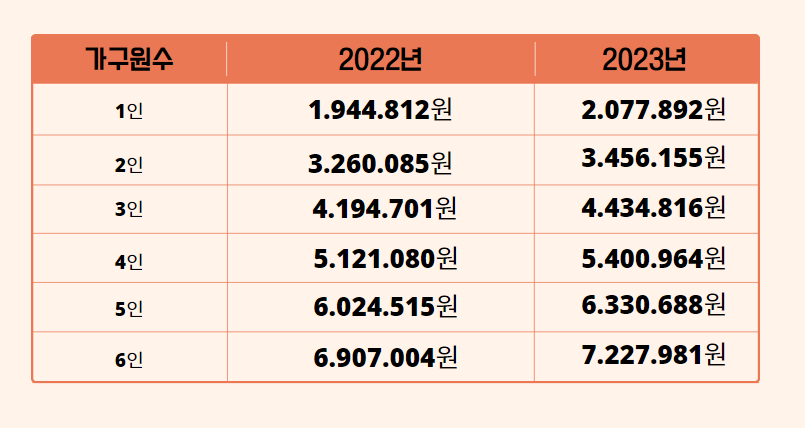 23년 중위소득은 22년 대비 5.47% 인상되었습니다.(4인 가구 기준)