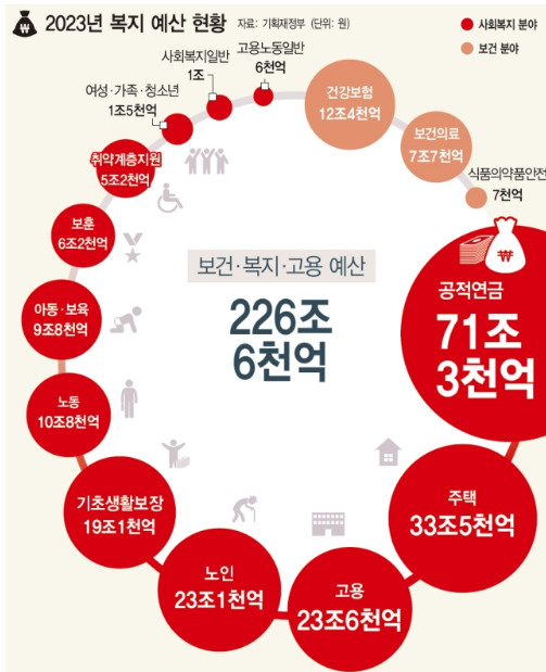 '약자 복지' 가 강화되었습니다.  즉 투자를 넓혀 사회안전망을 촘촘하고 두텁게 구축할 계획입니다 . 2023년 보건복지부 총 예산 108조 9918억원으로 편성되었습니다. 기준중위소득을 역대 최대인 5.47% 인상하고 재산기준 완화 등의 지원 확대입니다.